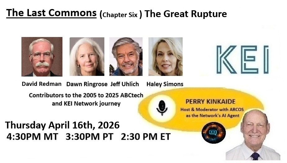 RECENT CONTRIBUTIONS - Let us help you, or - if not us - then we'll find you someone who can! Book + Audiobook. The Last Commons: Reclaiming Personal Sovereignty is about to be released as a bold exploratioin of what happens when knowledge - once the foundation of power- becomes commoditized, managed, and increasingly detached from the individual. It captures the substance of KEI Network and former ABCtech contributors over twenty years. Newsletters. Visit HERE to view the KEI Network's newsletters. We are always interested in contributions and Patrons like you to help keep the Network independent and alive. Webinars. Visit HERE to view the KEI Network's webinar playlists. Got an idea? Tell us, we are always interested in new content and can arrange all details for broadcasting and video production.